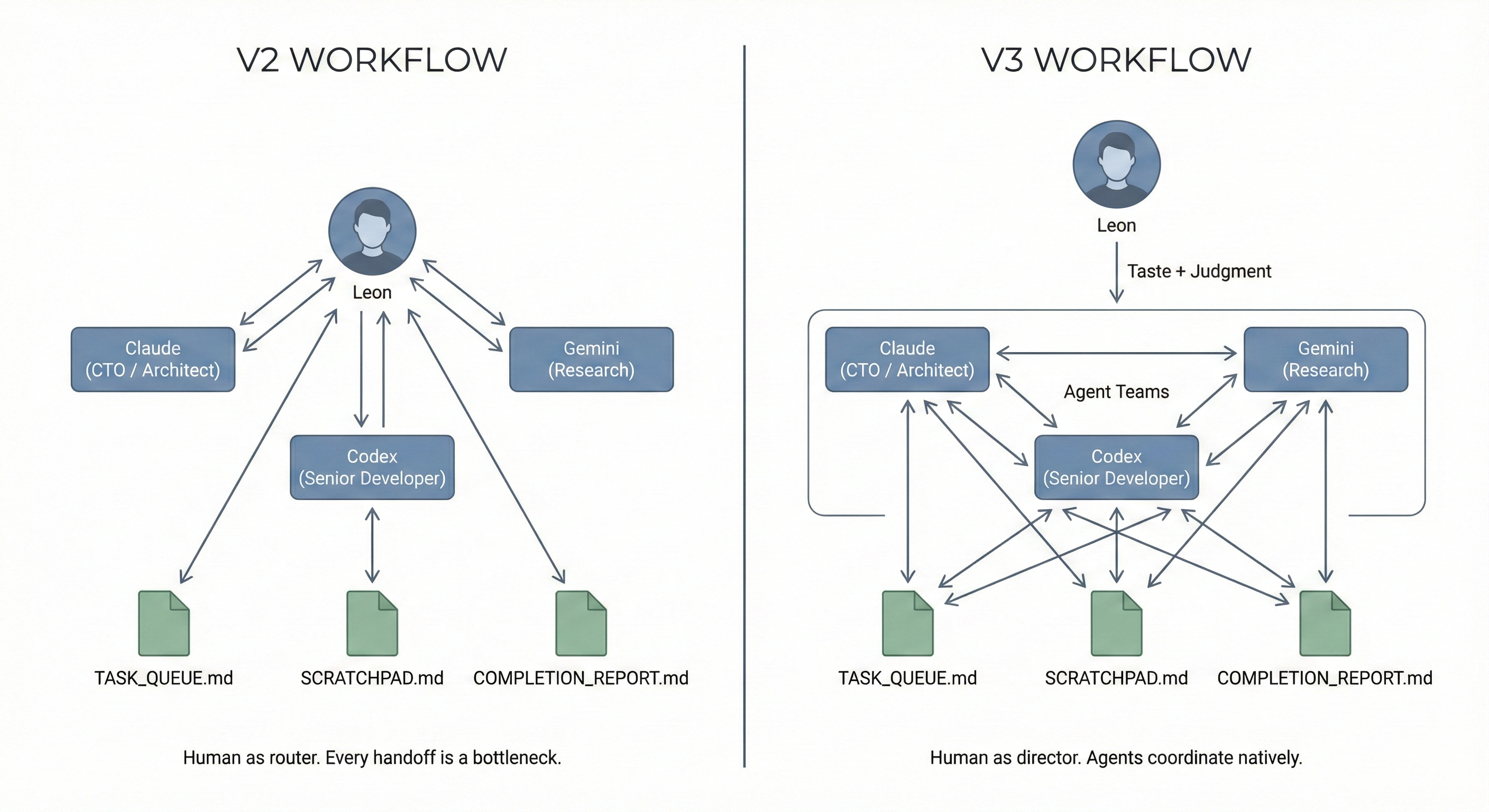 For V2, I’d built a multi-agent development workflow. Claude as CTO and architect. Codex as the senior developer handling implementation. Gemini for research. They didn’t communicate through some custom orchestration platform. They communicated through three markdown files: TASK_QUEUE.md (what needs doing), SCRATCHPAD.md (working memory and decisions), and COMPLETION_REPORT.md (what got done and how it deviated from the plan).